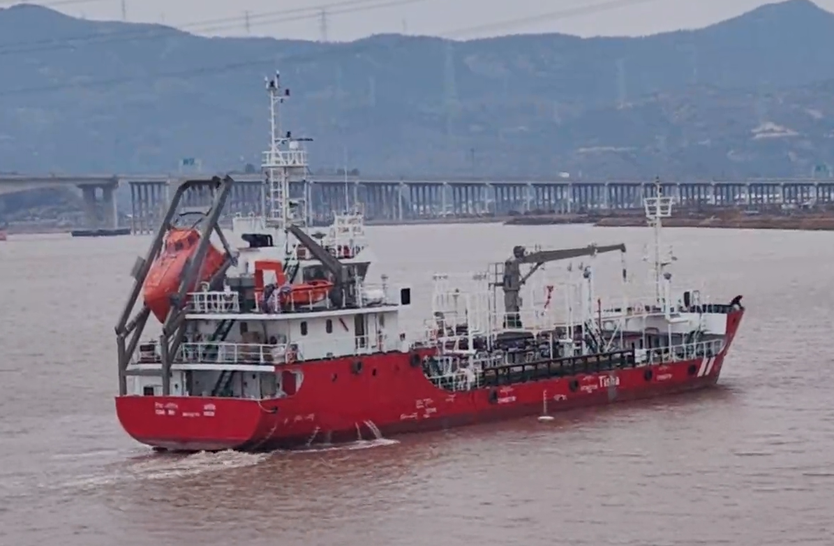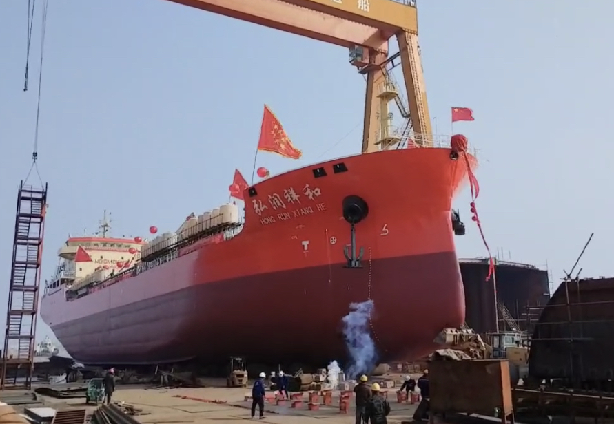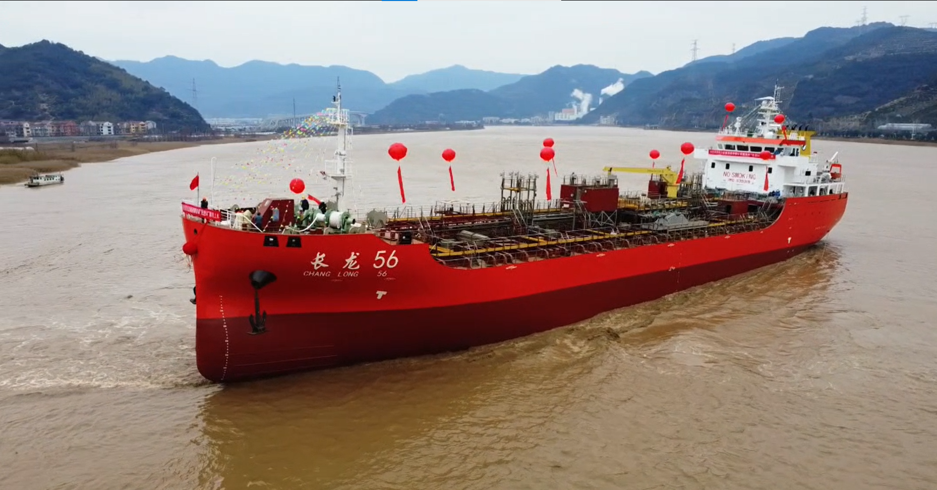 四、2026年1月21日,由我院为浙江长龙海运设计的4370DWT化学品油船“长龙56”在宏盛船厂顺利上水!